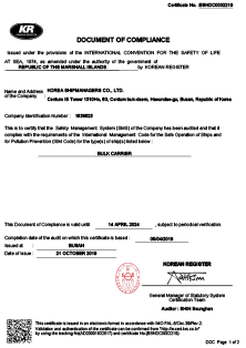- The International Safety Management Code is international safety management regulation and is to certify that a shipping company is able to ensure the safe operation of ships and the prevention of pollution. It is also certify that a shipping company complies IMO's regulation and eventually acquires improvement of its compliance. Certificates of this code will be issued to both shipping companies (Documents of Compliance) and Vessels (Safety Management Certificates) under investigation of flag states' offices.